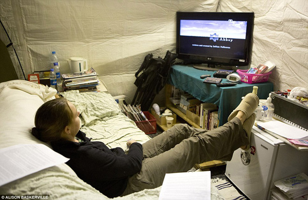 图为一名女兵在休息时观看电视剧《唐顿庄园》